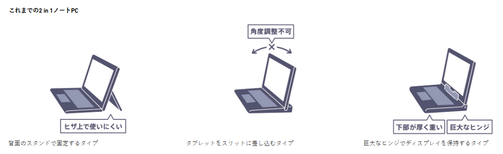 メリットはふつうのノートパソコンと同じでキーボード側が重心になるので液晶が自立することです。