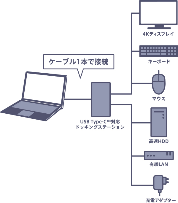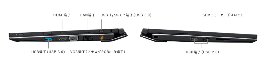 例えば、HDMIとVGAとイヤフォンは片側にまとまっています。USB端子とSDカードも同じ反対側に集まっています。LANとType-Cが短辺に集まっています。なので、映像系、データ系、通信系という感じでスッキリできます。