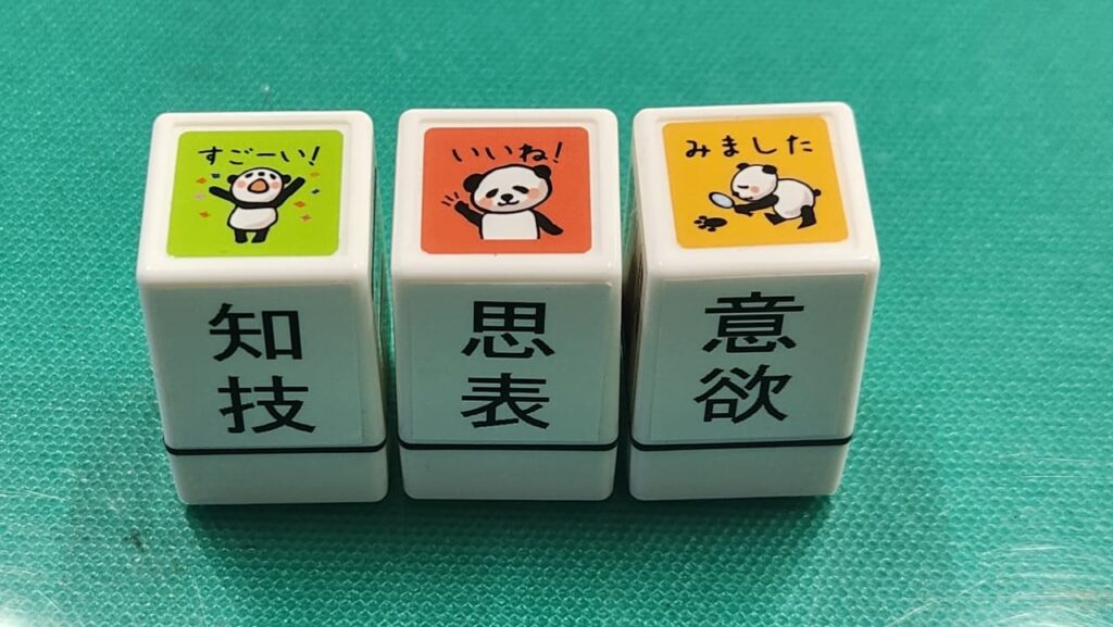 浸透印タイプのハンコにすることで、片手で作業できるし、3つの観点全てについて授業の中で生徒の目に見える形で評価できるようになります。